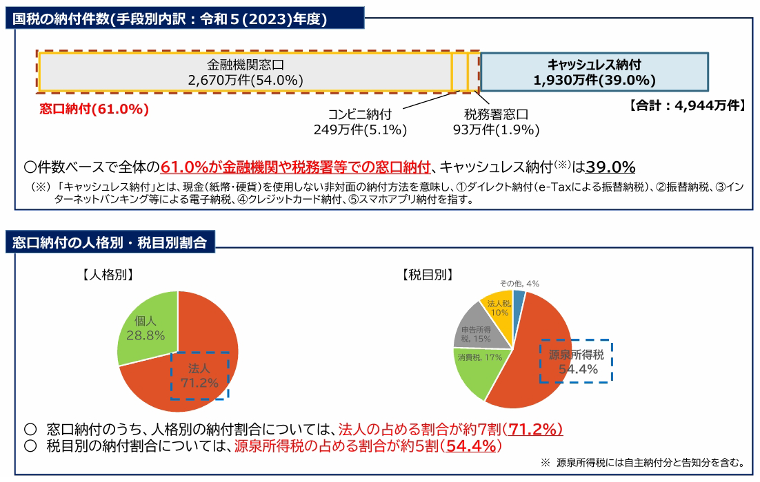 依然として金融機関を中心とした窓口納付が60%を超えており、また、納税額が多額になることが多い法人においては70%以上が窓口納付となっています。